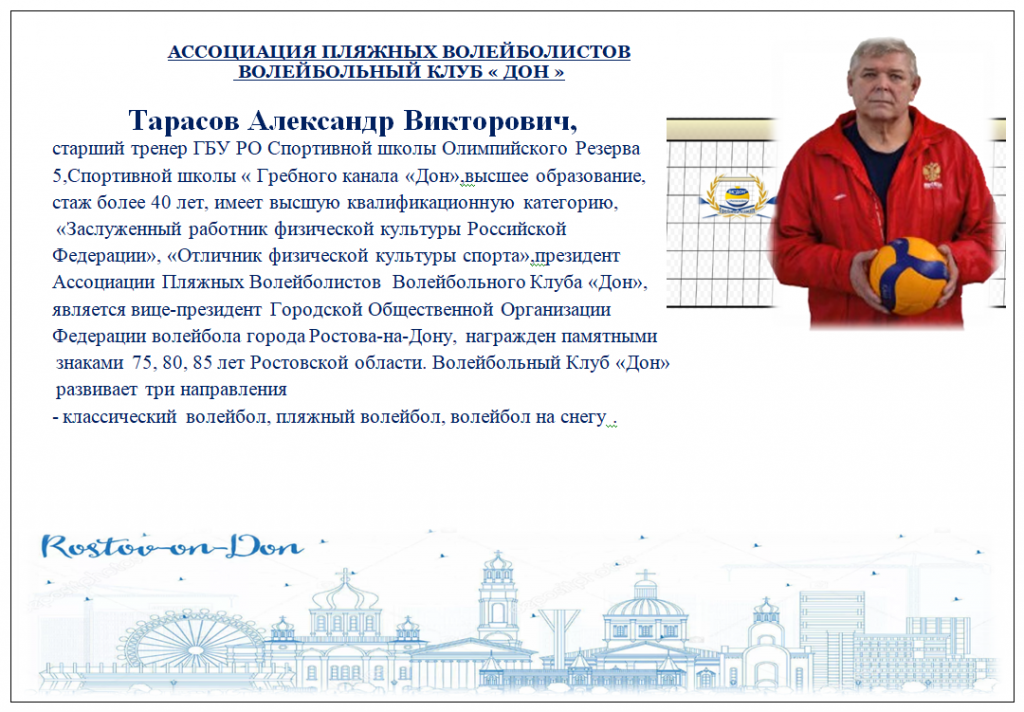 Основоположником детского пляжного волейбола — это тренер Тарасов Александр Викторович, до 2015 года являлся тренером молодежной сборной России по пляжному волейболу, подготовивший победителей Студенческой волейбольной лиги России по пляжному волейболу , серебряных призёров Студенческой волейбольной лиги России по пляжному волейболу , победителей Первенства России по пляжному волейболу, бронзовых призёров Первенства Европы Коровка Артем и Жирков Максим (г. Порту, Португалия), серебряных призёров Региональной серии Чемпионата России по пляжному волейболу , бронзовых призёров Первенства России по пляжному волейболу среди юношей старшей возрастной группы. Чемпионов Европы Ивана Чупринова и Владислава Панченко (Словения,2021 г.) .